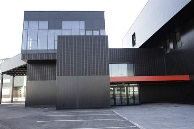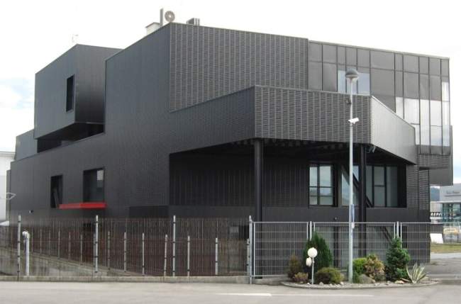 Metal i szkło czyli dwa materiały, które zestawione ze sobą SĄ WYZNACZNIKIEM NOWOCZESNOŚCI. Prawie cały budynek jest jednolity materiałowo – na elewację wprowadzono czarne, metaliczne panele, które, jak napisał sam projektant