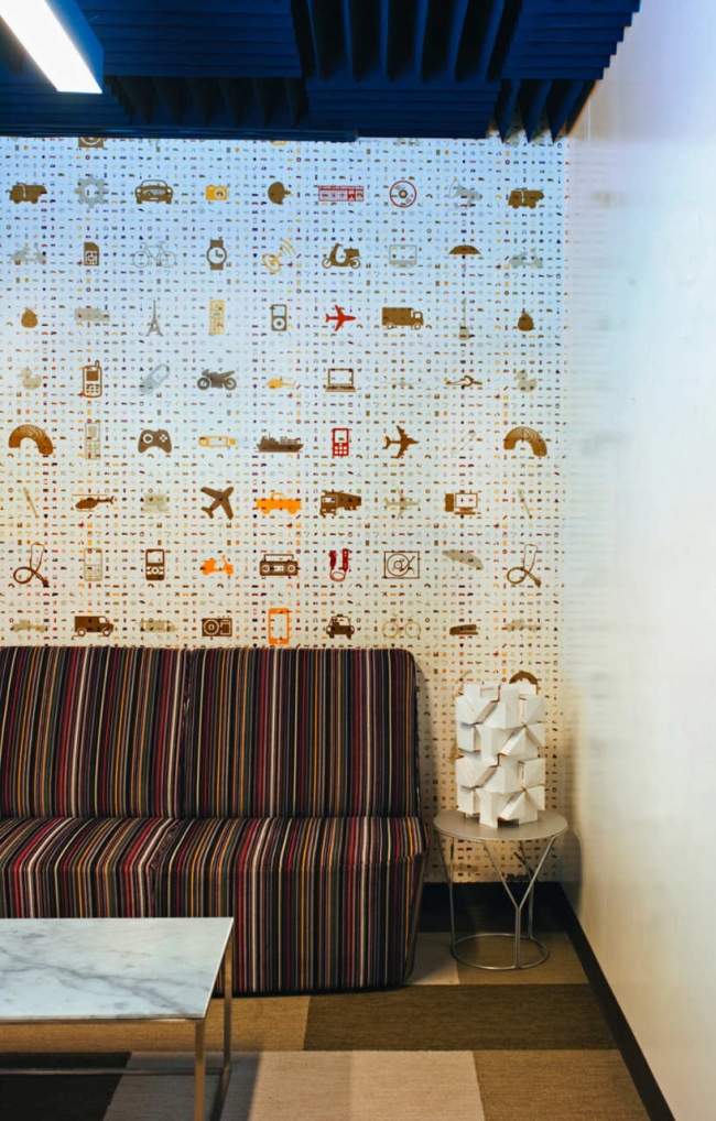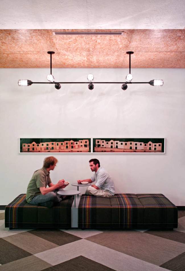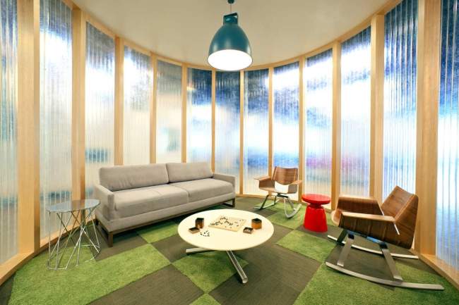 Co ciekawe, projektanci uznali, że ta przestrzeń nie będzie stricte wypoczynkowa i relaksująca. Ma również pobudzać i zachęcać pracowników do bardziej spontanicznych rozmów o prowadzonych projektach, grupowych dyskusji czy burzy mózgów. W końcu to przestrzeń wielofunkcyjna. ;] Dlatego znaleźć tam również możemy miejsca do stanowisk komputerowych czy ścianę, na której na bieżąco można zapisywać swoje pomysły. Zainspiruj się!