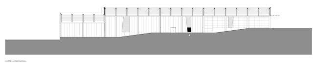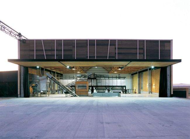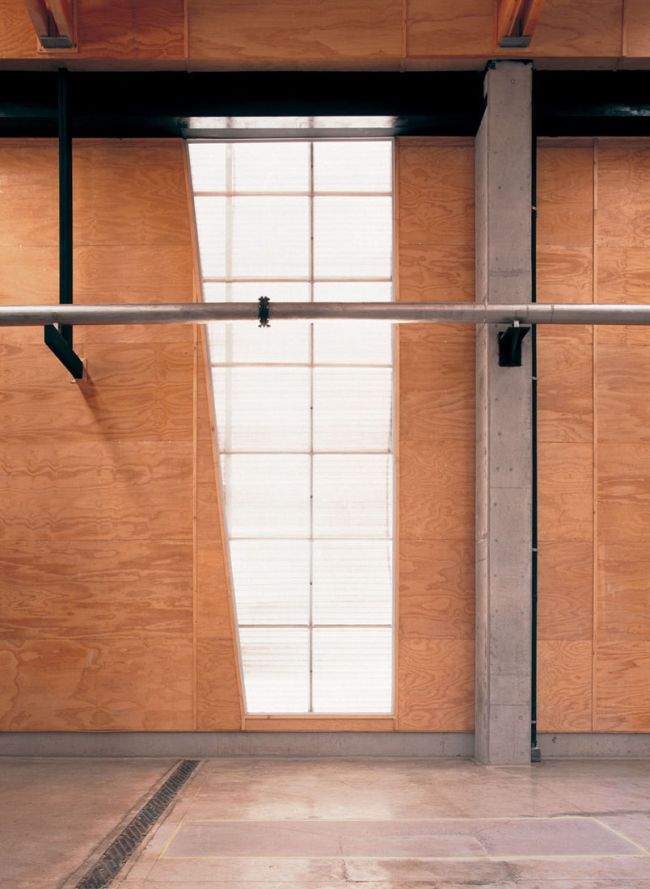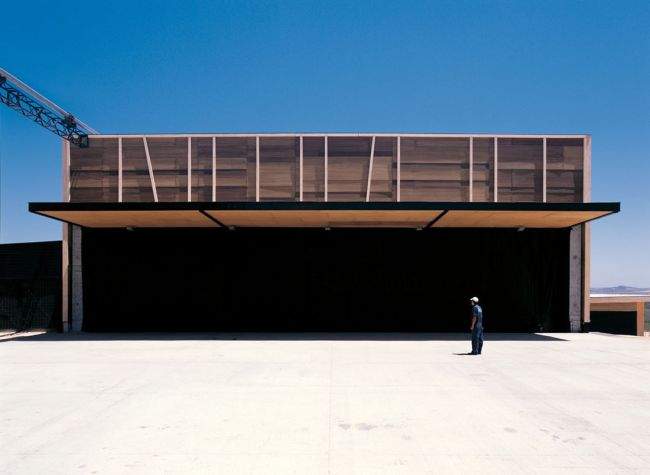 Drewno – to głównie jeden z tych surowców, które tutaj zauważymy i to na pierwszy rzut oka. Dlaczego? Bo jest przyjazny dla odbiorcy, ciepły i lekki zarazem, nieszkodliwy dla zdrowia, poza tym dobrze wpasowuje się w trochę pustynny krajobraz lokalizacji, w której usytuowany został budynek. Drewno stanowi tutaj “ubranko” dla betonowej konstrukcji hali. Ważne są również nieregularne podziały z pasów jasnego drewna w całej elewacji budynku. Zaraz się przekonamy skąd się one wzięły ;];]