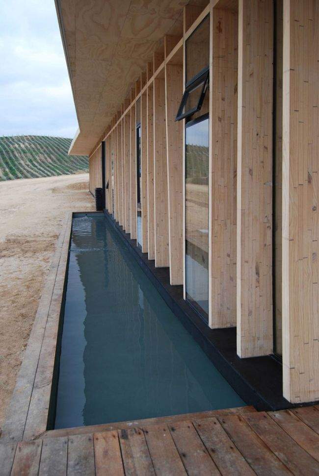 Niska, zwarta bryła budynku, obłożona drewnem w kolorze otaczającej zewsząd ziemi, z podziałami na elewacji w rytmie nieregularnych podziałów ziemi skibami stanowi jakby integralną część tego miejsca. Nie dominuje, nie krzyczy, nie zaburza – JEST IDEALNA!