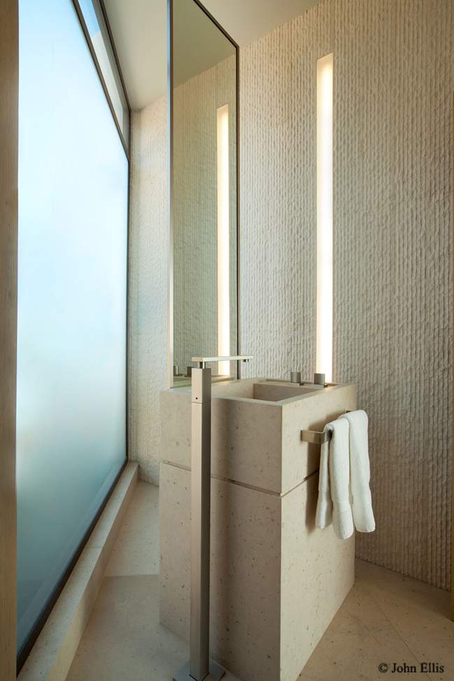 Materiały wykorzystane przy projekcie tworzą nietypową mieszankę – cała gama materiałów naturalnych staje się bardzo szykowna po dodaniu ekskluzywnych detali. Dzięki temu zarówno część wewnętrzna i zewnętrzna domu idealnie ze sobą harmonizują. Kluczowy jest tutaj także przemyślany układ pomieszczeń; jedno z pięter obejmuje domowe biuro i siłownię, inne – sypialnie, a na kolejnym znajdują się pokoje dzienne. Wszystkie kondygnacje sprytnie ukrywają się za wzgórzem.