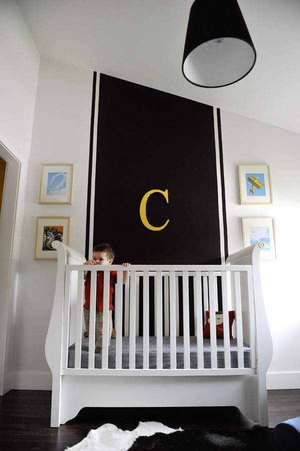 Twój niemowlak to królewicz? Podnieś rangę pokoiku dla niemowlaka :D Czarna tapeta i złota litera – Iście królewsko! (Zdjęcie i projekt: Melisa Fluhr)