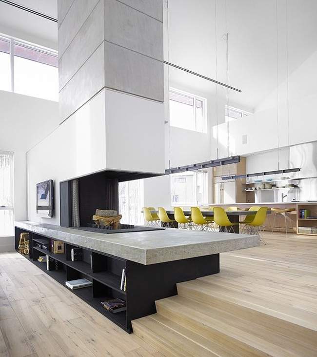– strefa dzienna tworzy całość. Kuchnia przechodzi w jadalnię i salon. Często jest połączona z korytarzem i SCHODAMI – kliknij i znajdz swoją inspirację nowoczesnych schodów;
