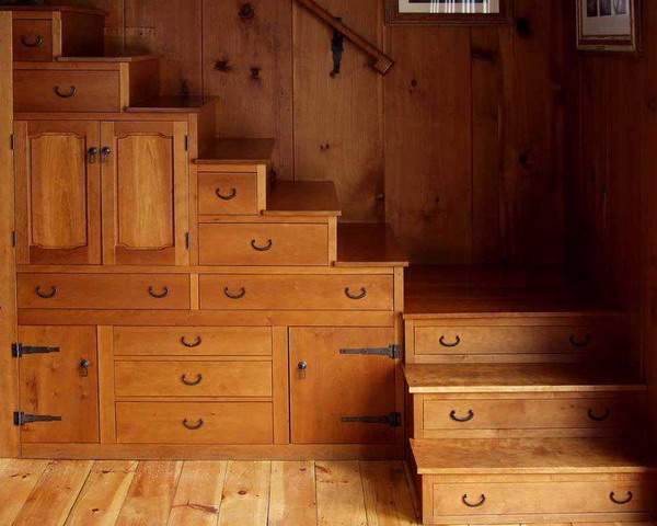 Przechowalnia. Najbardziej popularny sposób na wykorzystanie przestrzeni pod schodami. Szuflady i półki mogą przechowywać ciuchy, zastawę stołową czy też sprzęt sportowy. To miejsce może też służyć Ci jako przechowalnia w przedpokoju na płaszcze, buty i parasole. (Zdjęcie: Rowland Roques-O’Neil)