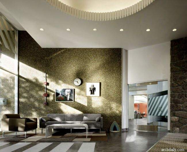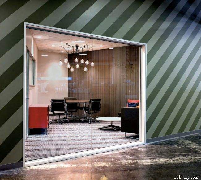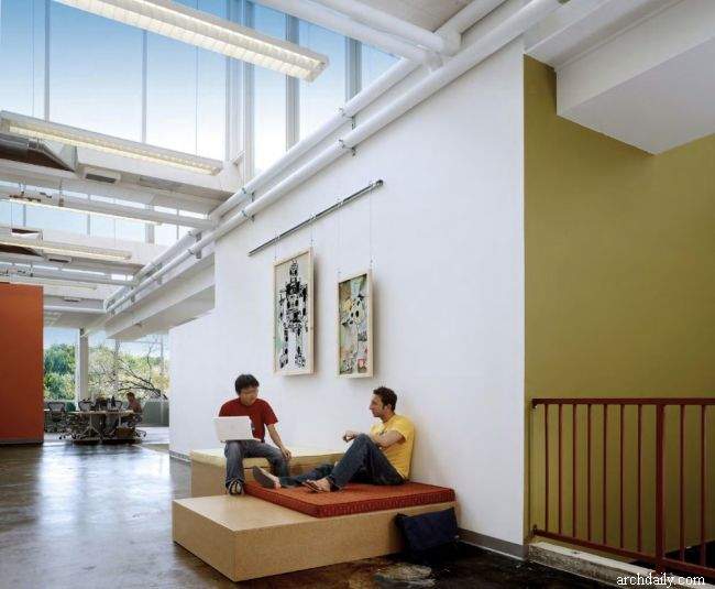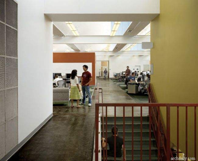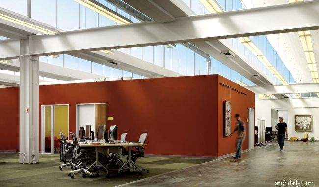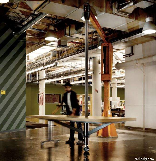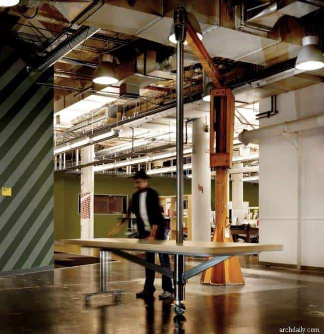 Świetnym podsumowaniem całej estetyki wnętrz jest pomarańczowy dźwig, który pozostał po innych pracach w budynku. Olivier DiCicco – rzeźbiarz – postanowił włączyć go do designu jako… część stolika! Odwołując się do przemysłowej estetyki budynku, przesłona filcowa rozpościera się na jednej ścianie i suficie. Jest tam również boisko do koszykówki i stół do ping ponga. Pracownicy więc mogą odetchnąć na chwilę od komputerowych obowiązków. I nikogo nie dziwi, że poruszają się oni po biurze przy pomocy dwukołowych deskorolek!
