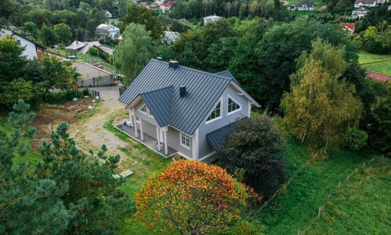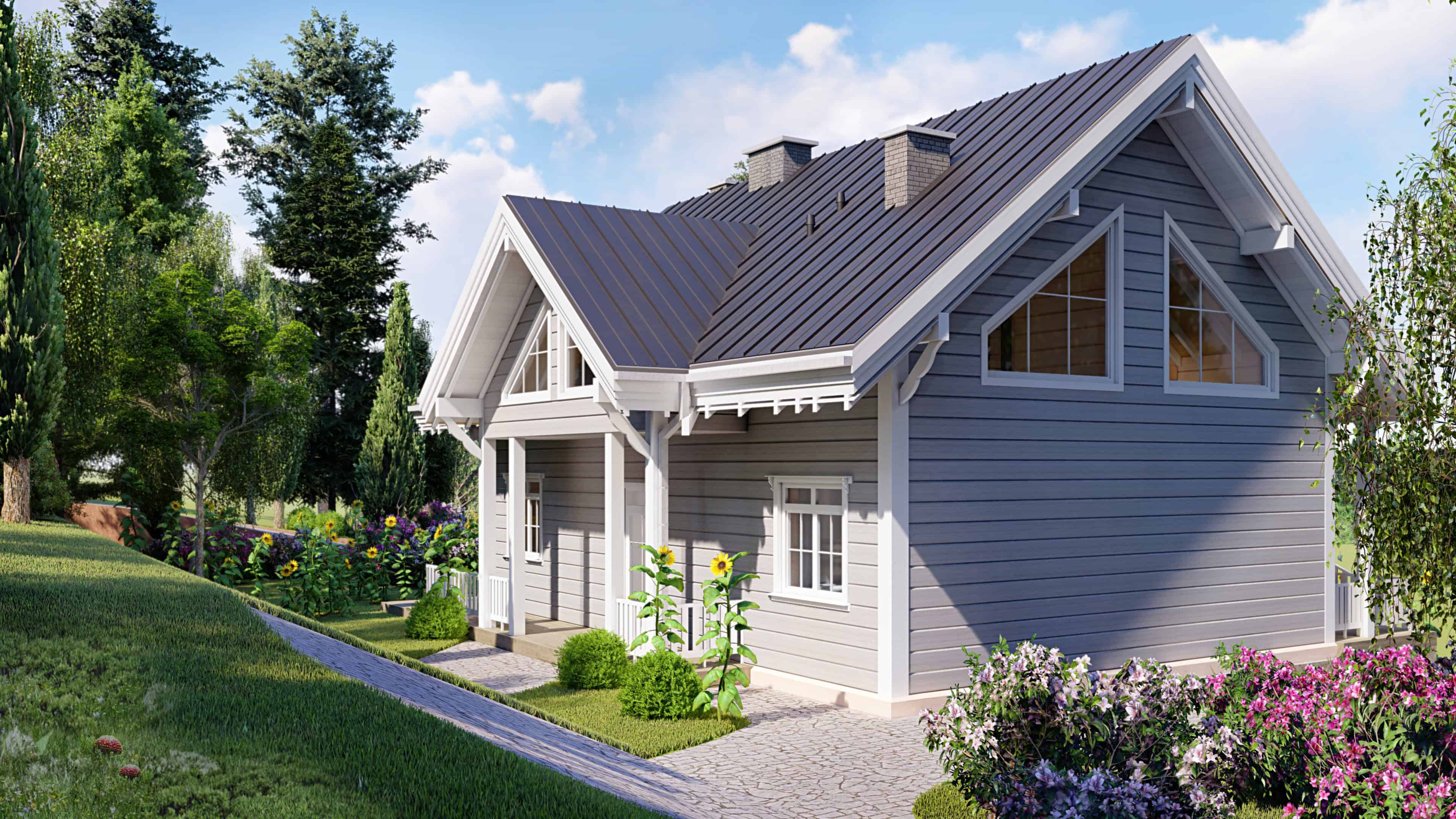 Nowoczesny drewniany dom z szarą elewacją i czarnym dachem, otoczony zielonymi drzewami i górami w tle, na tle nieba z chmurami.