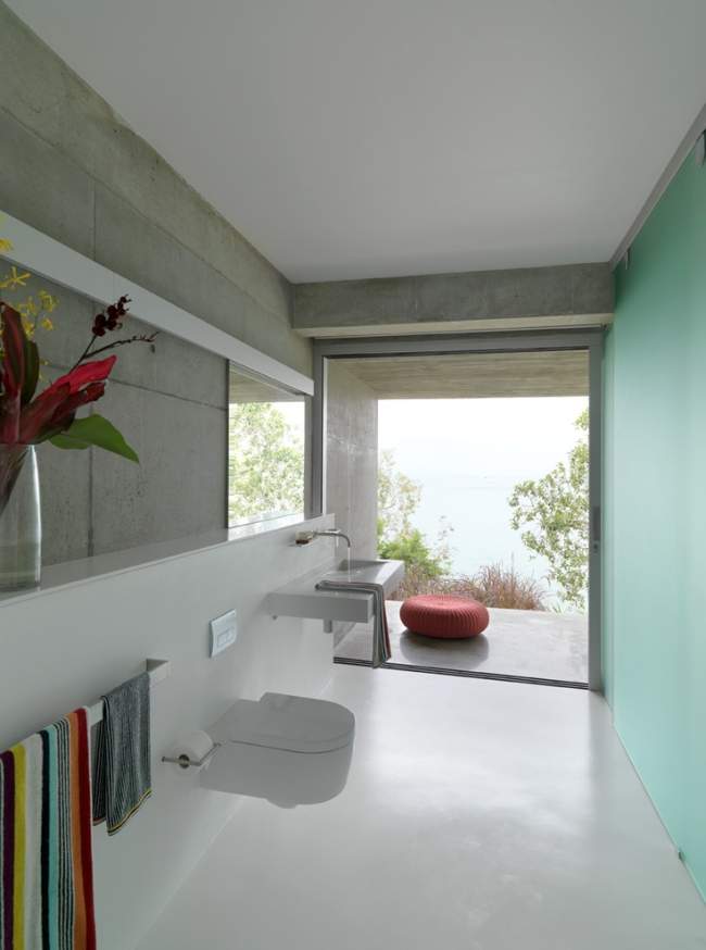 Tak wygląda nowoczesny salon Solis Residence – otwarta przestrzeń i proste rozwiązania to podstawa tego wnętrza. Bezpośrednio przy nim zaprojektowana została jadalnia i kuchnia – jednak – ze względu na niewielką aczkolwiek istniejącą różnice poziomów w tych przestrzeniach – zostały one od siebie oddzielone.Salon dwukondygnacyjny, z wysokim sufitem. Na drugim planie praktycznie otwarta kuchnia i jadalnia. Bo nowoczesne projektowanie to nowoczesne rozwiązania!Sypialnia znajdująca się na piętrze domu, jednak, podobnie jak pozostałe pomieszczenia, otwarta na całość. Zobacz jaki wspaniały widok rozciąga się z tego poziomu, z poziomu sypialni właśnie!Wnętrze łazienki kontynuuje główne założenia nie tylko projektu wnętrza, ale również projektu całego domu jak się okazuje. W łazience dominuje beton i szkło. Prosty, nowoczesny design poszczególnych elementów wyposażenia i niesamowite widoki.Jedno z wielu miejsc zaprojektowanych na zewnątrz domu – w tym przypadku jest to niewielki balkon wysunięty w kierunku zatoki.
