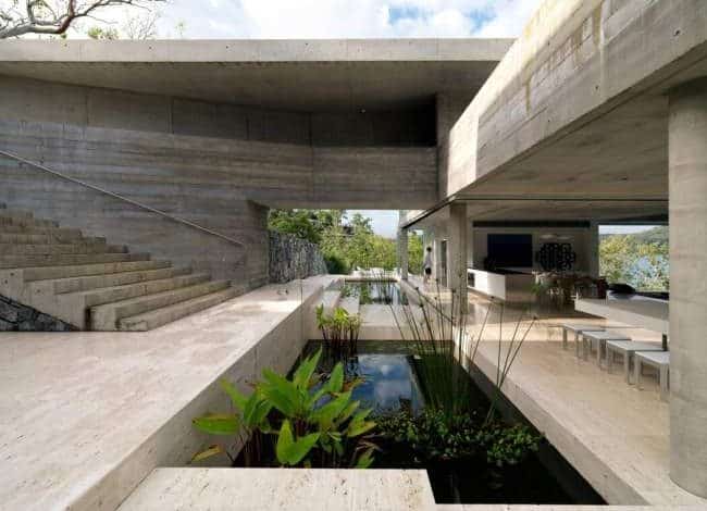 Nowe, nowoczesne wnętrze z otwartym tarasem i roślinami wodnymi, minimalistyczny design, architektura z betonu, idealne dla miłośników nowoczesnych rozwiązań i eleganckich przestrzeni.