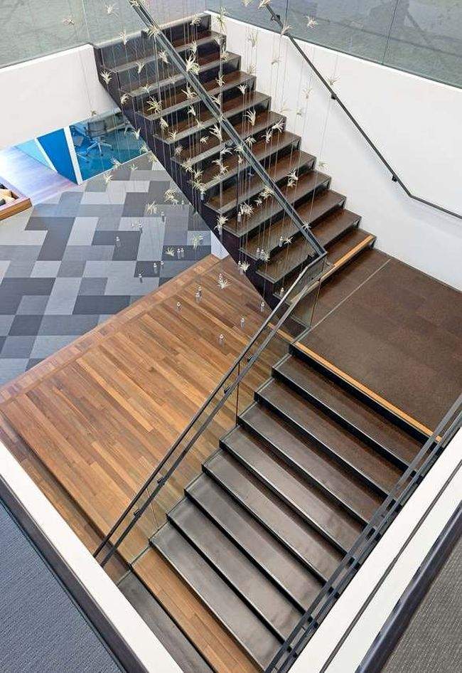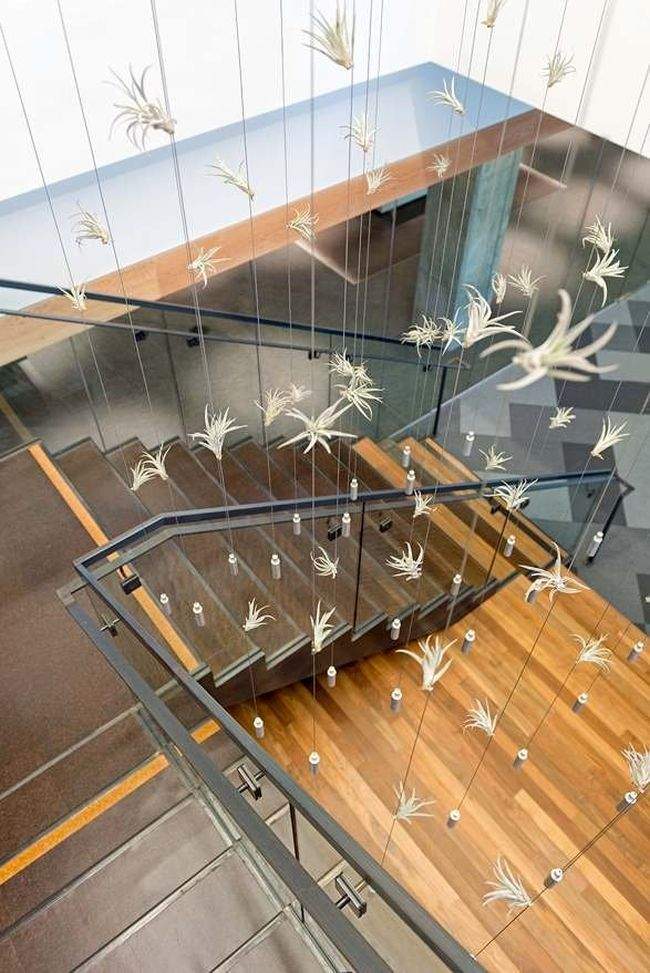 Wiszące dmuchawce w aranżacji klatki schodowej biura.