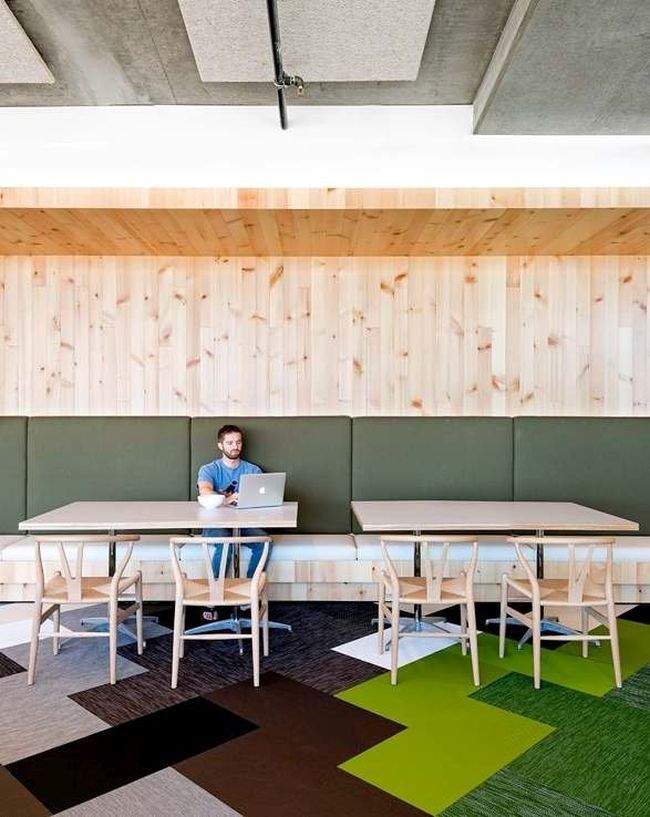 Strefa wejściowa siedziby firmy Cisco w San Francisco. Zwróć uwagę na design stolika w tej części biura – bardzo modna obecnie forma stolika wykonanego z jednego kawałka drewna wraz ze wszystkimi jego cechami jak słoje czy sęki – natura jest w modzie ;]Design biurka recepcji również nie musi być nudny ;] krzywa linia przełamuje prosty design a intensywny morski kolor orzeźwia wnętrze i świetnie współgra z drewnem na suficie.To już wnętrze biura i design miejsc do spotkań formalnych bądź nie, lub do pracy indywidualnej bądź chwili odpoczynku – sam wybierz do czego służyć mogłoby Tobie ;]