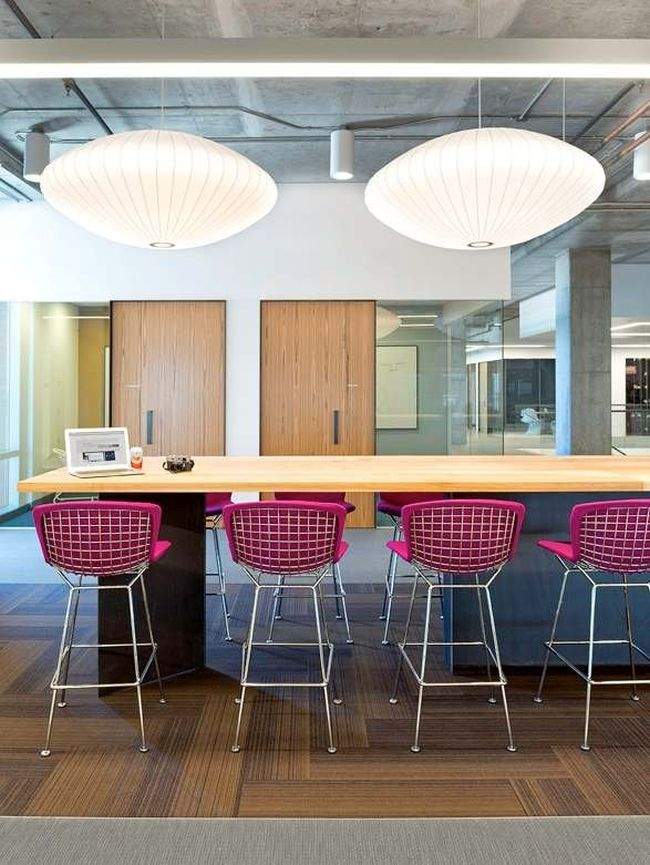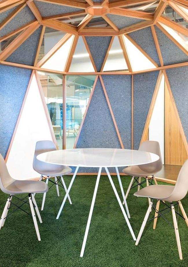 Ciekawy pomysł na zawieszki w formie dmuchawców ?;] nad miejscem zaaranżowanym do spotkań – takie rozwiązania sprawiają, że wnętrze nabiera charakteru.Widok z góry na to samo miejsce. Zwróć uwagę na ciekawy design stolika w kształcie nieforemnego pnia – podobny w zamierzeniu lecz odmienny w formie widzieliśmy w recepcji biura.Nowoczesny design lampy o wielu żarówkach zebranych w wiązki. Te lampy zlokalizowane są nad stołem części jadalnej w strefie socjalnej biura.Minimalistyczne rozwiązanie wnęki w ścianie obłożonej drewnem jako miejsca do pracy indywidualnej ale w nietypowej formie. Wnęka wykończona jest miękkim obiciem w kolorze blue navy, które zapewnia komfort jej użytkowania ;]Nowoczesne rozwiązanie siedzisk w formie stopni i kilku poziomów.Ciekawa aranżacja pokazanej wcześniej wiaty znajdującej się we wnętrzu przestrzeni biurowej siedziby Cisco. Nowoczesna konstrukcja z drewna wykończona w mocnych kolorach pozwala na odizolowanie tego miejsca od strefy otwartej biura.Kolejny inspirujący przykład na rozwiązanie sufitu w miejscu pracy. Znudziły Wam się zwykle sufity podwieszane? Może sufity z podziałami na trójkąty, wykonane z drewna i uzupełnione np. sklejką.Do tego wykładzina w intensywnym niebieskim kolorze i mocne turkusowe dodatki – nowoczesne wnętrze nie boi się odważnych zestawień kolorystycznych i materiałowych.