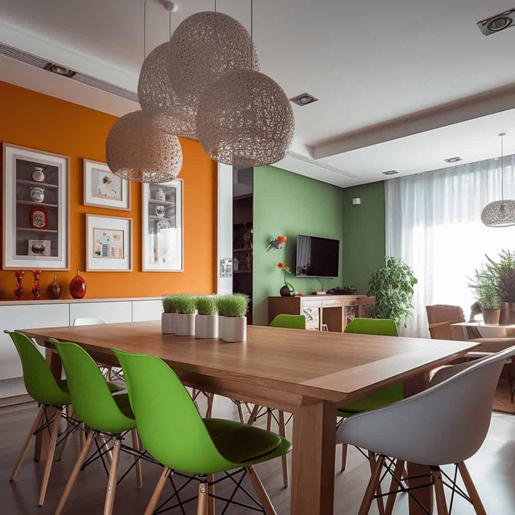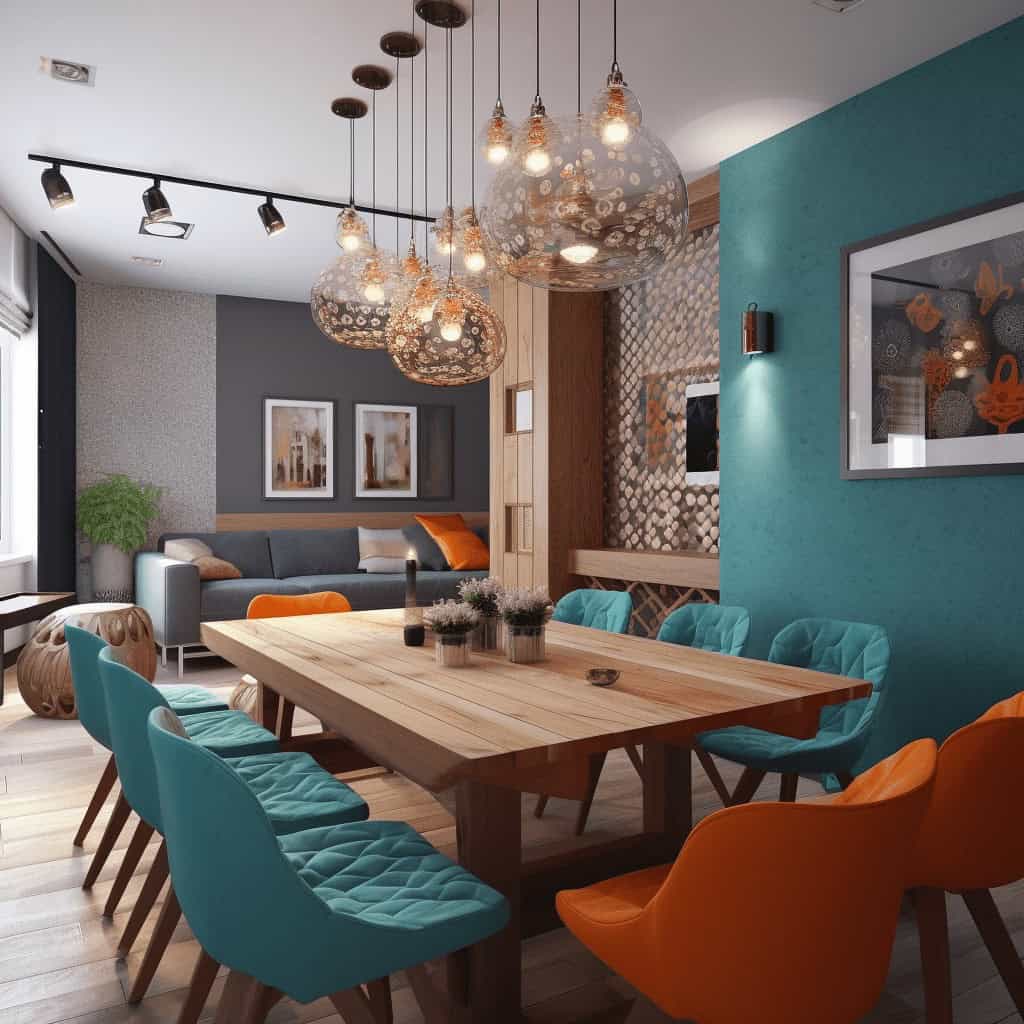 Jednym z najlepszych barw dla wystroju tych wnętrz to pomarańcz. Może na krzesłach?