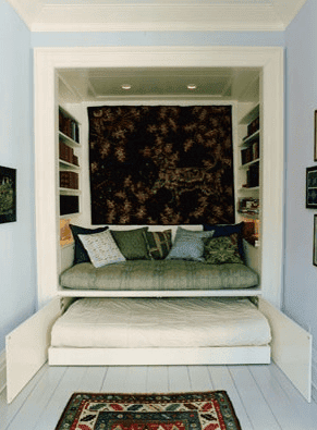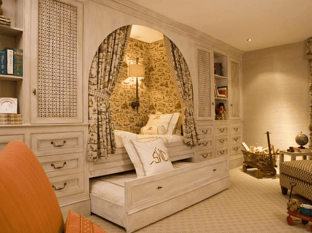 Lekko i wysoko. Amerykanie kupują w większości wysokie łóżka, a jeśli mają niskie, dokupują specjalne “gumowe pionki” aby podnieść je wyżej. Dlaczego? Bo pod łóżkiem znajduje się masa przestrzeni, którą można wspaniale zagospodarować! Szuflady, pudełka, schowki… Pamiętaj tylko, aby kupić długą narzutę :P (Zdjęcie: RH Baby & Child) Jeśli nie czujesz się komfortowo, śpiąc “w szufladzie”, wymyśl takie rozwiązanie dla gości – tym sposobem zapasowe łóżko nie zajmie Ci cennego miejsca. Pamiętaj, zabudowy są megapraktyczne i wcale nie takie drogie! (Zdjęcie: Mudrick)
