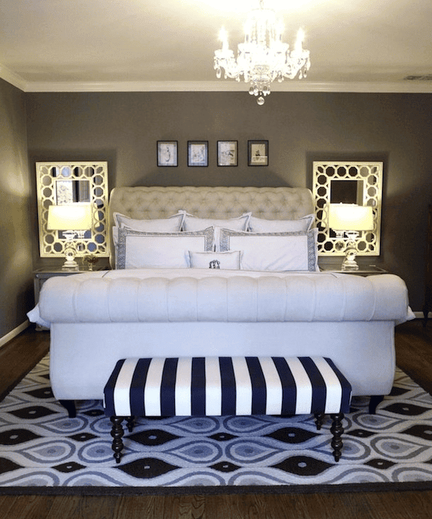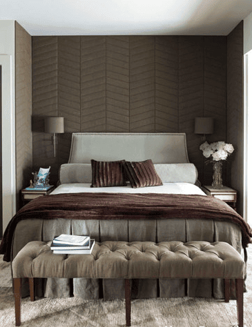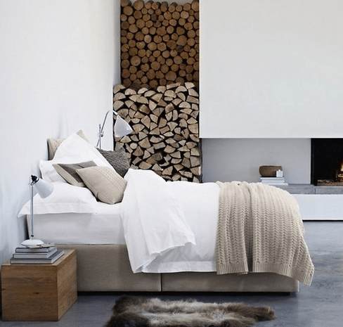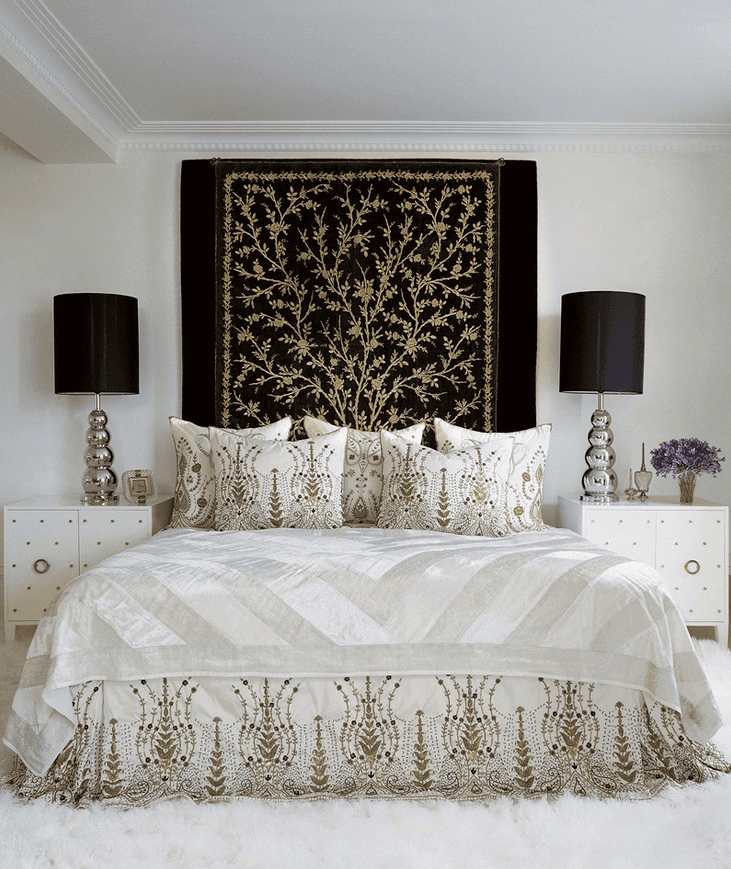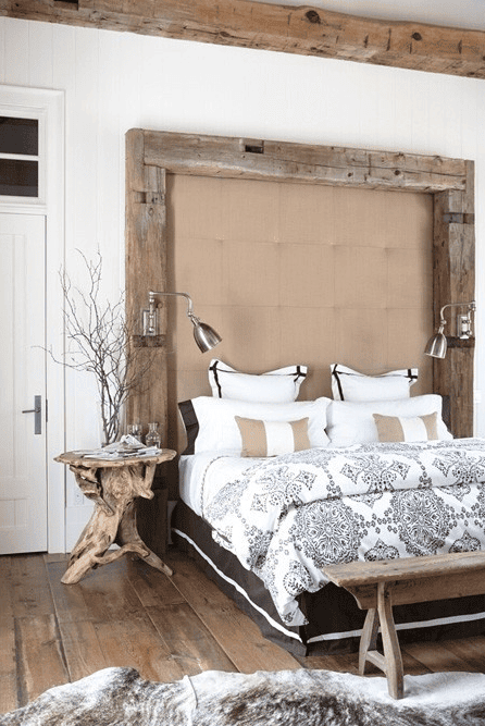 Masz babcię na wsi? Zdobądź drzwi od jej starej stodoły albo część jej drewnianej konstrukcji i wyeksponuj jako ramę łóżka – efekt gwarantowany! (Zdjęcie: UPCYCLEDTREASURES) Kominek w sypialni? Mam i używam! Polecać nie muszę, fani ognia wiedzą, dlaczego, a Ci, którzy go pragną – wiedzą za czym tęsknić ;] Jednak drewno w sypialni… zastanów się, zanim zaczniesz wyciągać leśne żyjątka z pościeli ;] (Pachnie pięknie, ale wszystko ma swoje plusy i minusy). Zdjęcie: The White Company Złota sypialnia a’la “gwiazda TV” ;] Pikowane meble ciągle są w modzie! (Zdjęcie i projekt: AV Hospitality)