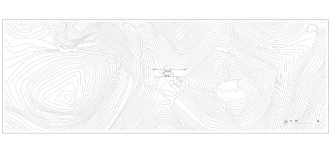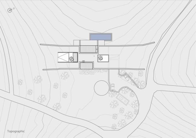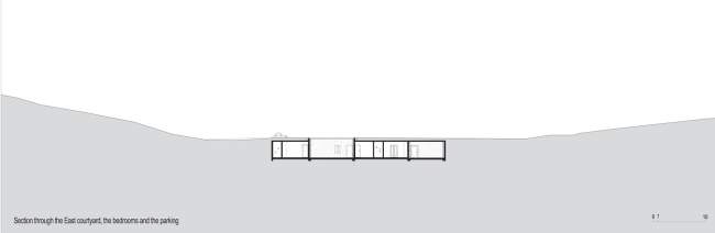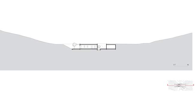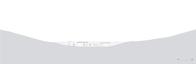 Dom usytuowany jest między dwoma wzgórzami a jego struktura i forma tworzą coś w rodzaju mostu pomiędzy nimi. Budynek spokojnie i lekko zagłębia się częściowo w ziemię, co w końcowym efekcie sprawia, że środkowa jego część znajduje się na powierzchni. Główne wzmocnienie budynku i jednocześnie osłonę przed silnym wiatrem stanowią dwie grube, długie ściany zewnętrzne wykończone kamieniem. Tym samym kolorystycznie i materiałowo nawiązują one do lokalizacji i krajobrazu, w którym się znajdują.