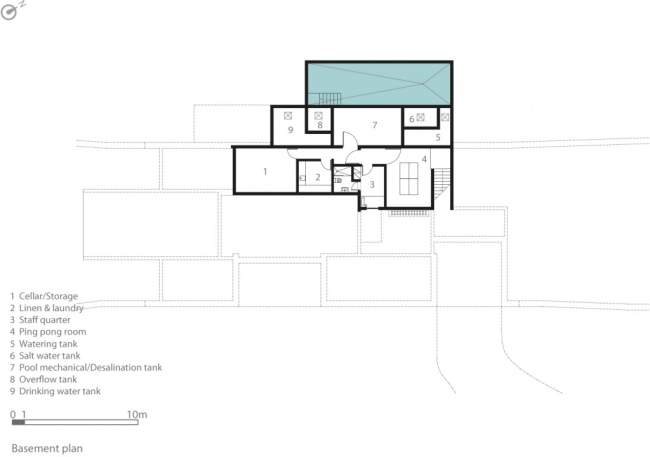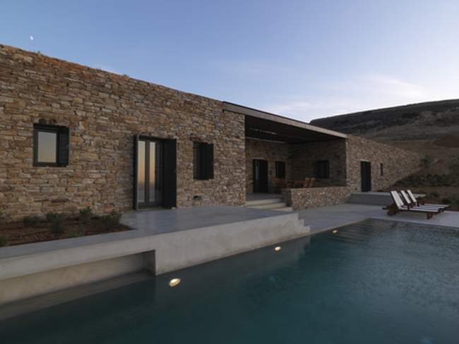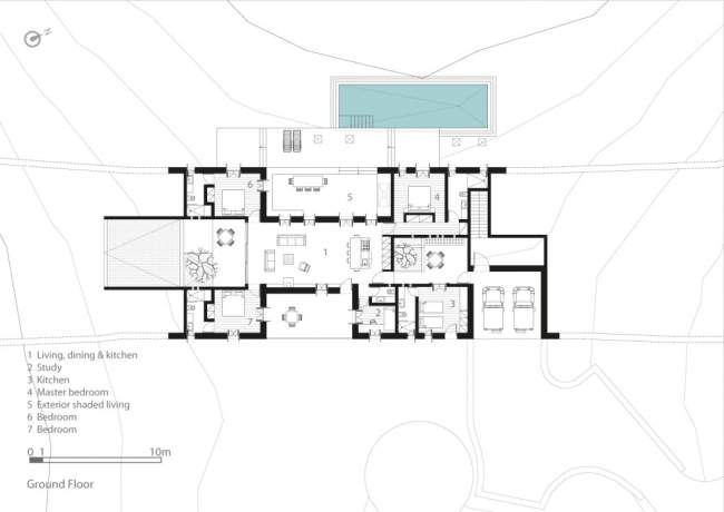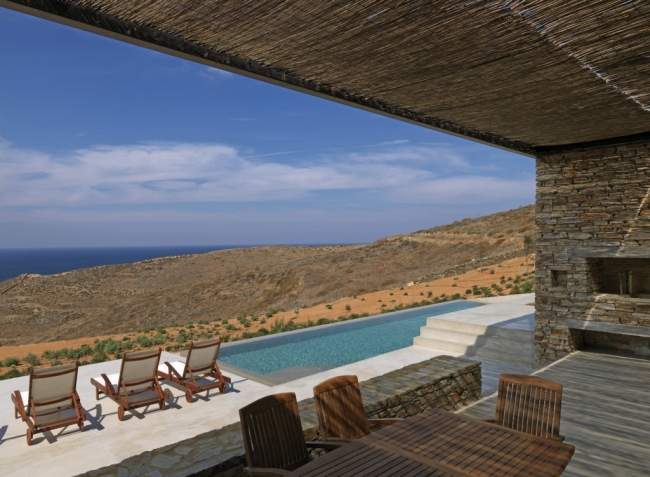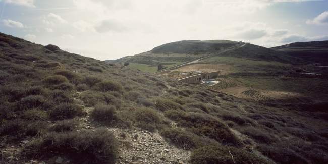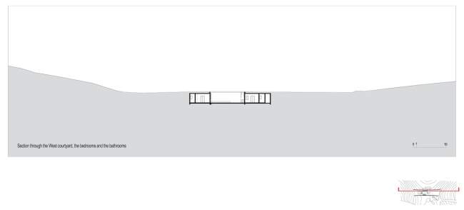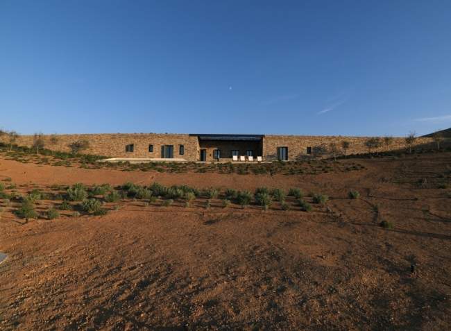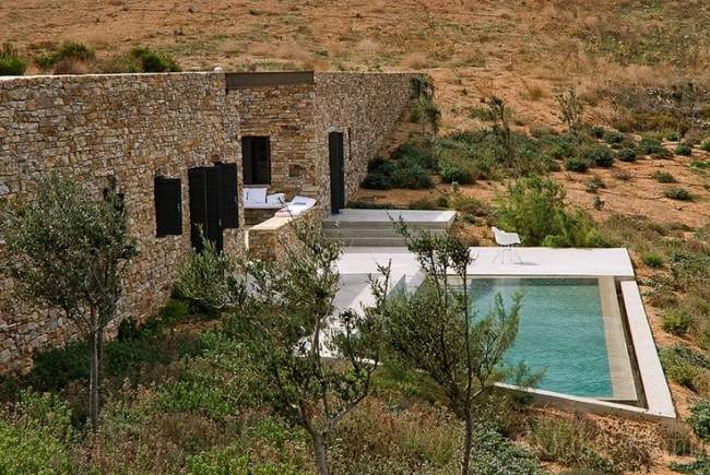 Jedne ze wzgórz, między którymi rozpięty jest Aloni House. I dach domu, stanowiący most między wzgórzami.Istotnym atutem tego projektu i jego późniejszej realizacji jest na pewno wykorzystanie tamtejszej roślinności, co jeszcze ściślej łączy budynek z jego lokalizacją. Zewnętrzne patio – może w ten sposób? Patio przy ziemiance widzieliśmy również w nietypowym rozwiązaniu w Ville Vals w Szwajcarii prawda? Które bardziej przypada wam do gustu?;]Prosta forma, obłożona kamieniem ściana zewnętrzna i basen o powierzchni 43 m2.