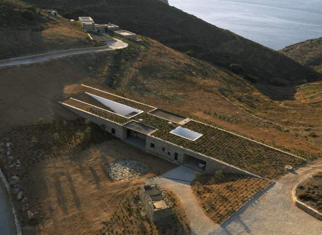 Dzięki temu, że Aloni House czyli nasza dzisiejsza ziemianka mieszkalna jest zagłębiona w ziemi, świetnie dostosowuje się do topografii i krajobrazu, w którym się znajduje. Umiejętność wykorzystania potencjału działku to jeden z wyznaczników nowoczesnego projektowania. Zgadzacie się ze mną?;] Ziemianka mieszkalna jako pomost między wzgórzami – to się nazywa nowoczesne projektowanie, projektowanie w kontekście ;]Widok na dach Aloni House, na sąsiadujące wzgórze z zabudową oraz wewnętrzne patio. Dach również został specjalnie zaprojektowany i stanowi on w tym wypadku nie piątą, a 3 elewację domu – z wiadomych względów;]Ziemianka mieszkalna wśród zieleni – również bardzo inspirująca!